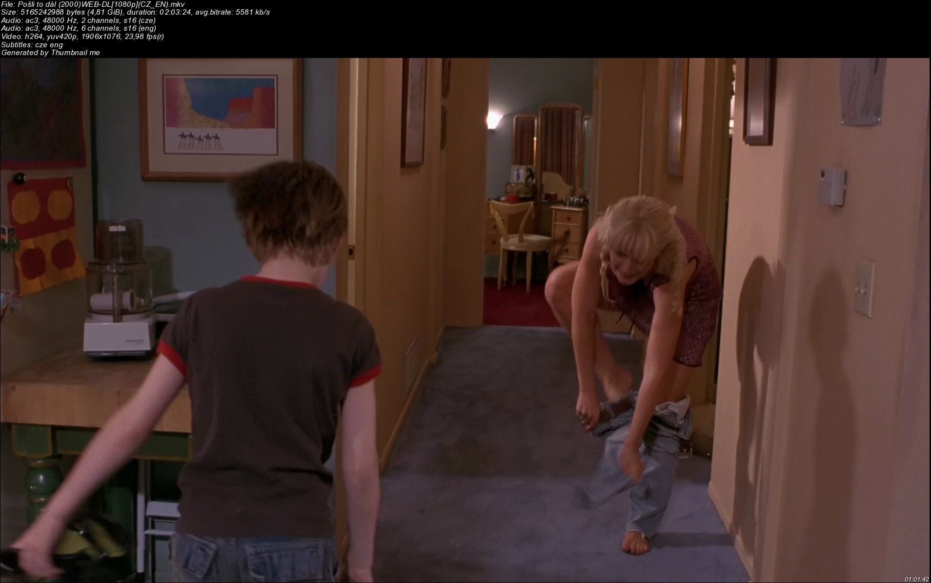 Celý název a cesta: Pošli to dál (2000)WEB-DL1080p(CZ_EN).mkv Formát: Matroska Format_Version: Version 4 / Version 2 Velikost souboru: 4,81 GiB Duration/String: 2h 3mn Celkový BitRate: 5 581 Kbps Encoded date: UTC 2016-02-12 04:44:30 Použitý software: mkvmerge v6.7.0 ('Back to the Ground' 64bit built on Jan 9 2014 18:03:17 Enkódoval: libebml v1.3.0 + libmatroska v1.4.1