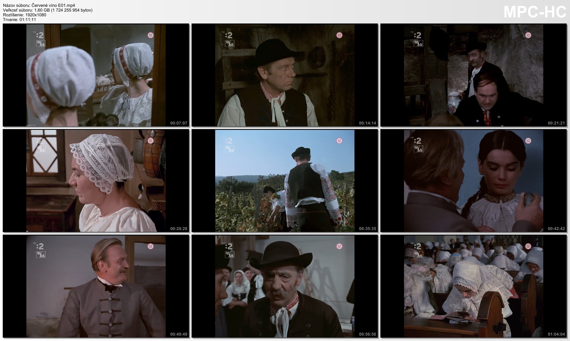 Jazyk: SK Titulky: Ne Obraz: 30831 kbs, 1920 x 1080, 25 fps Zvuk: 192 kbs, 48 khz, 2 kanaly Odkaz na CSFD: https://www.csfd.cz/film/27978-cervene-vino/prehlad/ Rok vydání: 1972 Délka: 1h 11m + 1h 11m + 1h 17m Žánr: Rodinný / Dráma