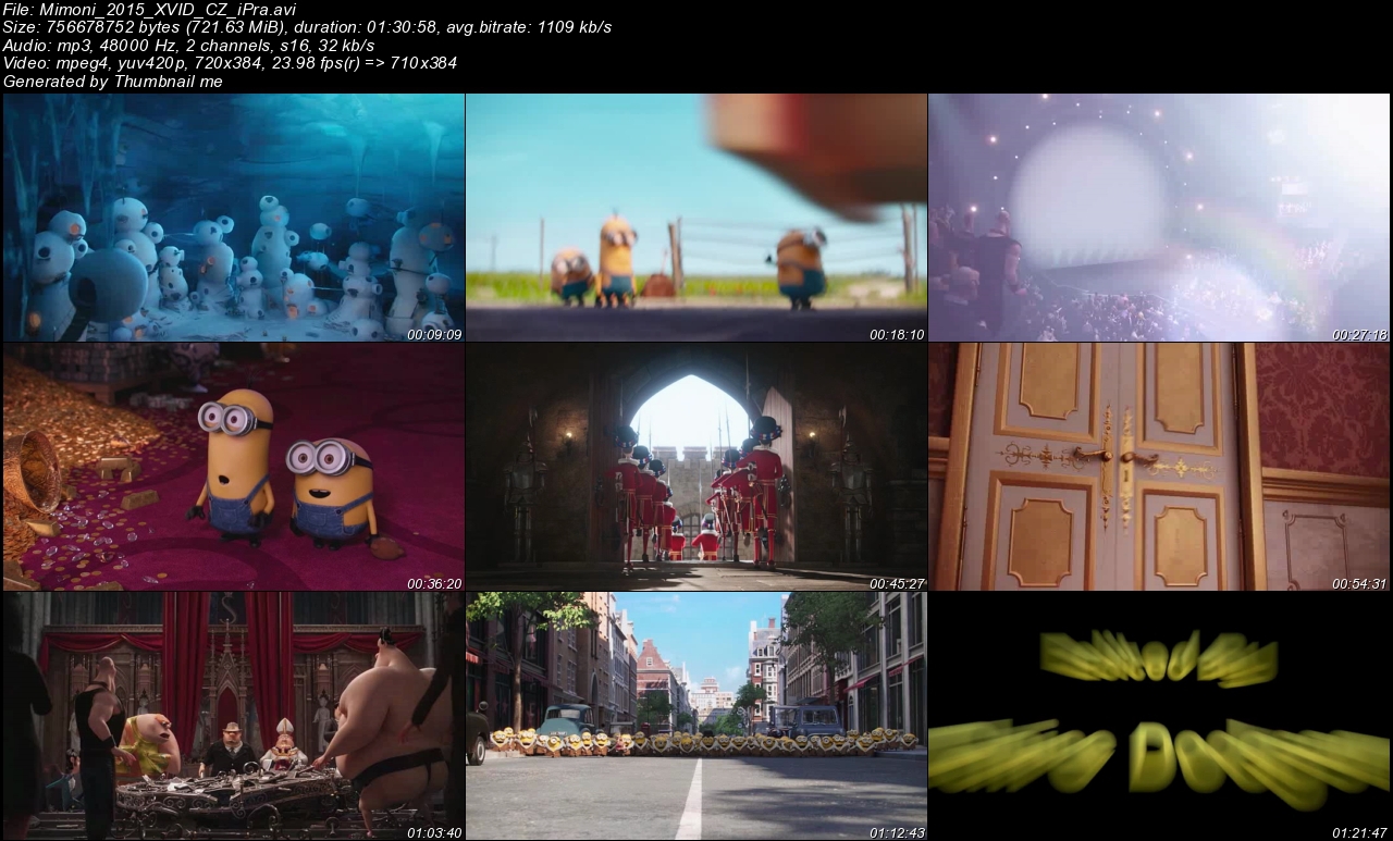 Zamysleli jste se někdy nad tím, proč vlastně ti žluťoučcí a k sežrání roztomilí Mimoni dobrovolně slouží Gruovi, padouchovi s velkým P? Odpověď přináší animovaná komedie Mimoni, která z nich konečně a především zcela zaslouženě dělá hlavní postavy jejich vlastního příběhu. Odpověď na výše uvedenou otázku najdete hned úvodu, který mapuje historický vývoj Mimoňů. Představte si, že tihleti dobráci od kosti vidí odnepaměti smysl své existence v posluhování tomu největšímu darebákovi široko daleko. Kdykoliv shodou náhod, ke kterým často přispívali oni sami, o svého pána přišli, hned si hledali dalšího. A tak to šlo celá staletí, od Tyranosaura Rexe, přes hraběte Drákulu a císaře Napoleona až do okamžiku, kdy žádného nového nadřízeného najít nedokázali a upadli do hluboké deprese. Tu zvýraznila i skutečnost, že se v onen tragický moment nalézali v zemi věčného sněhu a ledu. Naštěstí se v jejich středu zjevili tři hrdinové – hrdý Kevin, hladový Stuart a lehce vystresovaný Bob. Ti vyrazili do světa, aby všem svým mimoňským kamarádům vrátili smysl života. Štěstěna je zavedla až do Ameriky, na floridský festival zločinců všeho typu, jehož se měla zúčastnit i absolutní královna světového zločinu, Scarlett Odkráglová. „Ta a žádná jiná!" řekli si Kevin, Stuart a Bob a okamžitě zahořeli touhou začít pro Scarlett pracovat. Sympatie rozhodně nebyly oboustranné, přesto se zlodcera s trefným příjmením rozhodla vyzkoušet jejich schopnosti. Co takhle šlohnout britské korunovační klenoty? A tak se Kevin, Stuart a Bob vydávají do staré dobré Anglie, přičemž zdaleka netuší, že v příštích dnech není v sázce jen to, co bude Alžběta nosit na hlavě, ale také samotná existence jejich živočišného druhu.