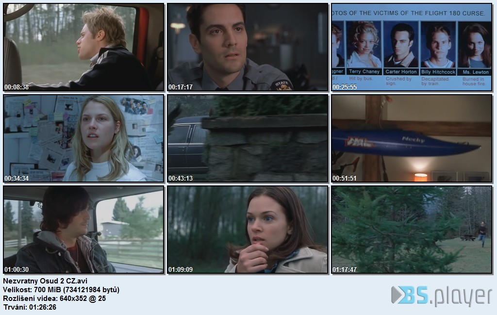 2. Díl: Clear Riversová (Ali Larterová) jediná prežžila katastrofu letu č. 180. Vššetci ostatní pasažžieri, ktorí rovnako ako ona najprv unikli pádu lietadla, sa neskôr jeden po druhom odporúčali do chladnej náruče smrti. Nezvratný osud si postupne vybral ich žživoty a vyrovnal tak číslo náhodne prežžitých takmer na nulu. Clear vie, žže ona je teraz na rade. ŽŽe smrt sa na ňu užž chystá a len náhoda ich môžže zachránit. Bohužžiaž je jediná, ktorá tomu verí. Vššetcia ostatní si myslia, žže ššok zo smrti jej priatežov bol natožko silný ažž stratila súdnost. Preto ju teraz držžia pod zámkom na psychiatrickej klinike, kde si ju môžže smrt nájst pri jednej a tisícej príležžitosti. No smrt má zatiaž inde plné ruky práce. Kimberly Cormanová (A.J.Cooková) má zvlᚹtnu víziu - ona a jej priatelia zomreli na ceste č. 23 pri straššnej zrើke áut, kde lietali časti tiel spolu s kovom a plastovými úlomkami. Bol to nejaký psychický záchvat strachu? Alebo snáď varovanie? Kimberly je na najlepššej ceste do ústavu za Clear. Dožžije sa toho vôbec?