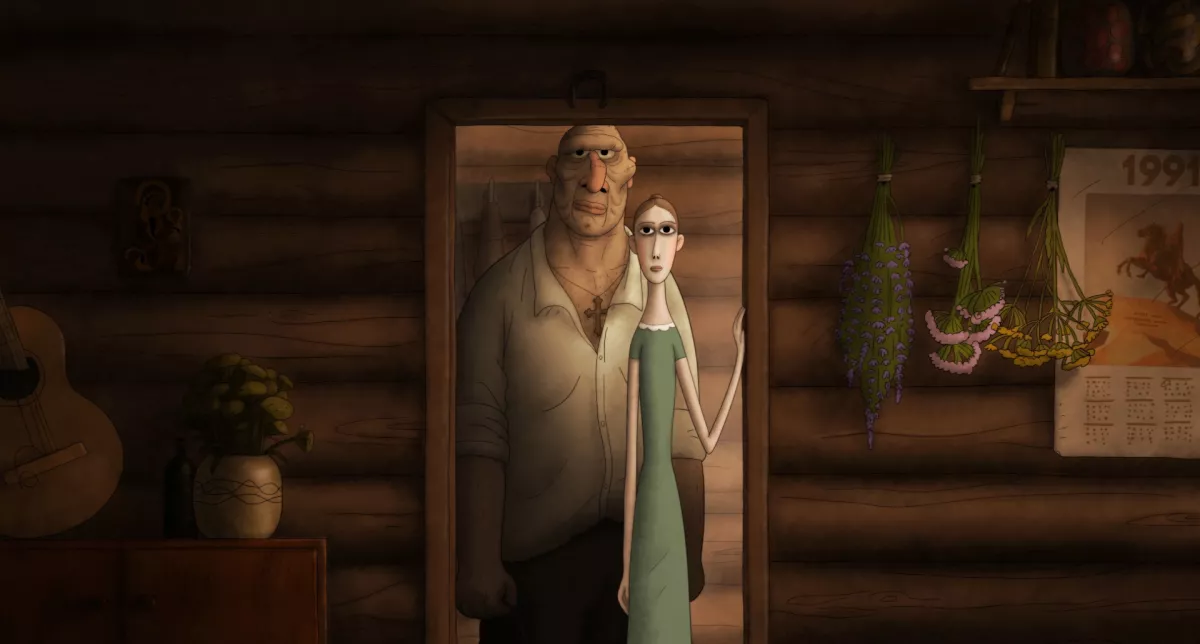 Director Anton Dyakov says of the boxer Evgeny, “I wanted to show, behind the brutality and coarseness, the anxious soul of a child. The character of [the ballerina] Olya was much more of a mystery for me. For Evgeny, I drew heavily on my own feelings, but feminine energy is a different kind of energy. I spent a long time drawing, searching for Olya’s face, a combination of subtle beauty and elegance, but not overloaded with detail. While Evgeny’s face is a complex landscape, a patchwork of creases and scars, Olya’s is like a classical amphora, simple and elegant.
