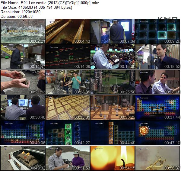 Přeložený název: Lov částic Originalní název: Hunting the Elements Jazyk: CZ Titulky: Ne Délka: 2 x 56 min Rok vydaní: 2012 Žánr: Dokumentární Země: USA Aktiv / pasiv: aktiv Odkaz na CSFD: https://www.csfd.cz/film/339884-lov-castic/galerie/
