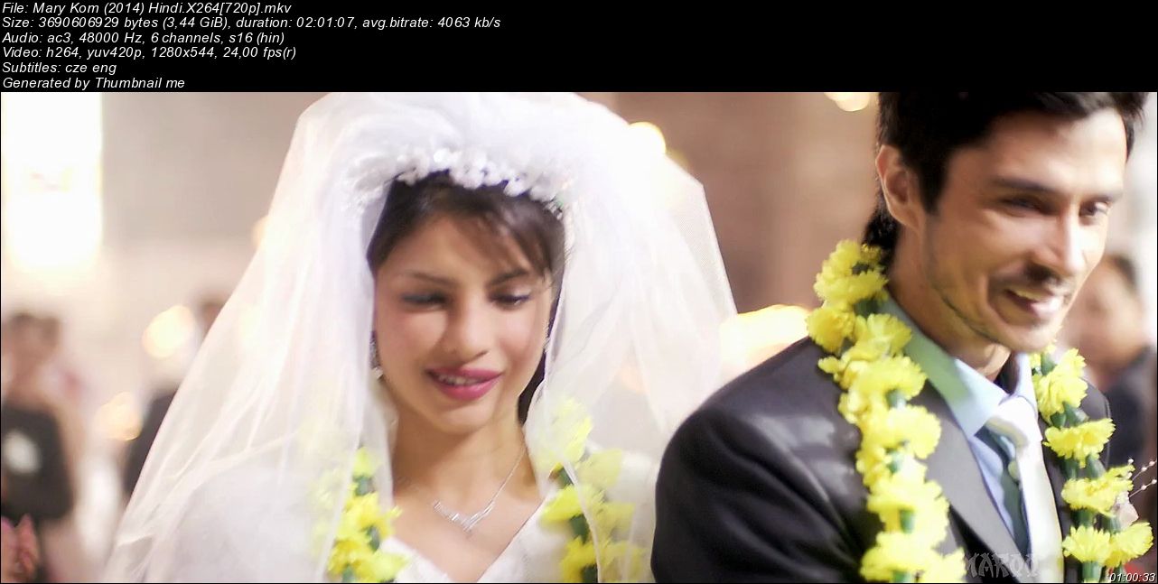 Celý název a cesta : Mary Kom (2014) Hindi.X264720p.mkv Formát: Matroska Format_Version: Version 4 / Version 2 Velikost souboru: 3,44 GiB Duration/String: 2h 1mn Celkový BitRate: 4 063 Kbps Encoded date: UTC 2016-02-08 19:32:01 Použitý software: mkvmerge v6.7.0 ('Back to the Ground' 64bit built on Jan 9 2014 18:03:17 Enkódoval: libebml v1.3.0 + libmatroska v1.4.1