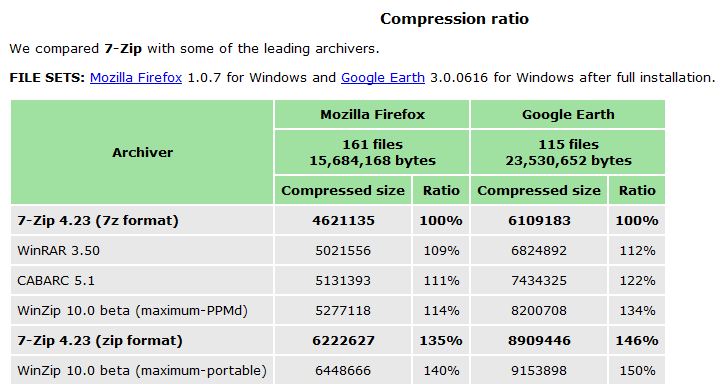 * Pro ZIP a GZIP formáty, 7-Zip nabízí kompresní poměr, který je 2-10% lepší než poměr poskytnutých PKZip a WinZip
