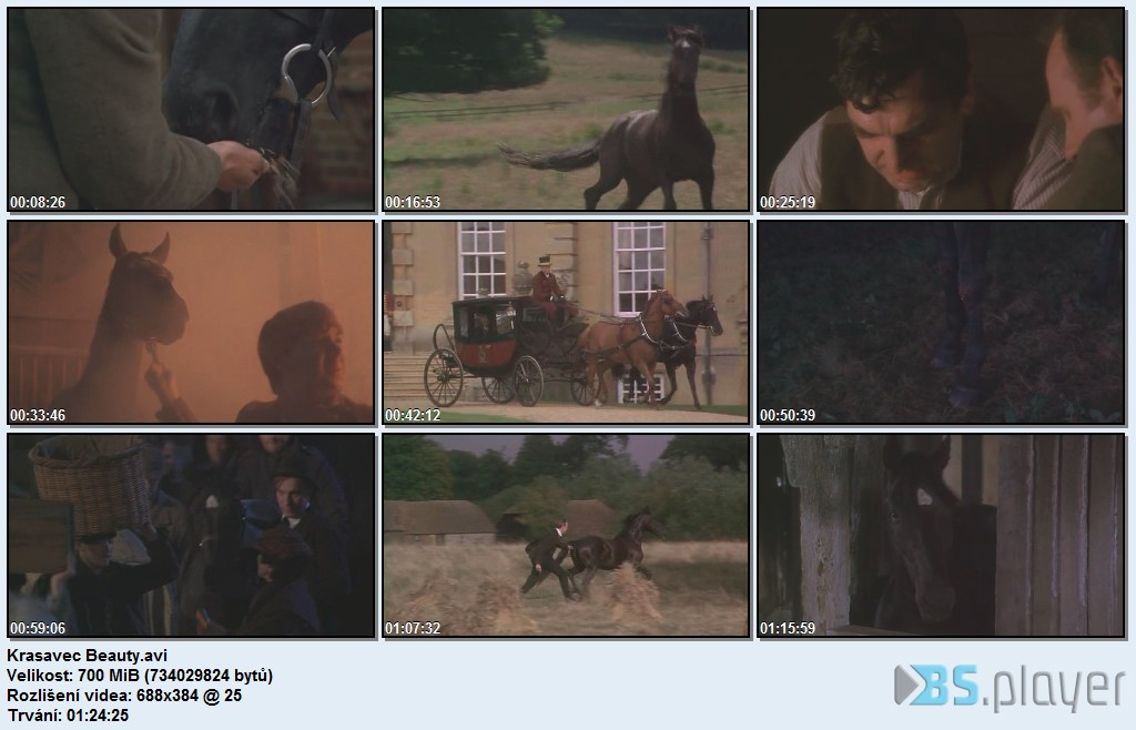 Vyprávění černého hřebce nás přivádí na panství zámožné rodiny, která si jej jako hříbě zakoupila. Bohužel paní onemocněla a tak musela spolu s rodinou opustit rodnou zemi a odjet do zámoří do lepších klimatických podmínek. Koně prodali, ale chlapec, který se o něj staral, slíbil, že se pro něj jednou vrátí. Od této chvíle nastává pro Beautyho nelehké období. Když našel hodného majitele, vždy se stalo něco zlého a ten jej musel prodat. Ovšem přece jen se dočkal šťastného stáří - původní podkoní si za léta našetřil nějaké peníze a koně si koupil.