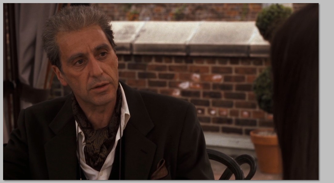 Člověk financí a politiky. Al Pacino v hlavní roli závěrečné části proslulé mafiánské trilogie. Francis Ford Coppola uzavřel svou mafiánskou trilogii snímkem Kmotr III (1990) po více než patnáctileté odmlce. Začátek jejího děje umístil do roku 1979, tedy plná dvě desetiletí od závěru Kmotra II. Michael Corleone (Al Pacino), nyní šedesátiletý, dál ovládá pevnou rukou své obchodní zájmy. Velmi usilovně se však snaží odpoutat od vlastní kriminální minulosti a své obchody legalizovat. Jeho zájem se přesunul od hazardu k nemovitostem a investičním bankám. A stal se z něho zbožný a vůči církvi nesmírně štědrý člověk, neboť přízeň Vatikánu, kde má několik vysoce postavených přátel, má v jeho proměně v bezúhonného byznysmena sehrát rozhodující úlohu. Jako svého nástupce jmenuje Vincenta Manciniho (Andy Garcia), nelegitimního potomka Sonnyho Corleona. Násilí však z vlastního života nelze jen tak jednoduše vymazat a je jen otázkou času, kdy minulost začne promlouvat do přítomnosti. Na rozdíl od prvních dvou částí vznikal Kmotr III až na několik newyorských scén prakticky celý v Itálii (v exteriérech v Římě a jeho okolí, v sicilském Palermu a Taormině a také v dekoracích postavených ve čtyřech největších ateliérech římského studia Cinecitta). Z klíčových členů štábu zůstali jen kameraman Gordon Willis, výtvarník Dean Tavoularis a samozřejmě spoluautor scénáře Mario Puzo.