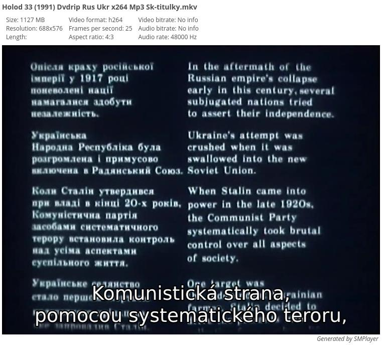 MediaInfo: Format: Matroska Format version: Version 4 / Version 2 File size: 1.10 GiB Duration: 1h 31mn Overall bit rate mode: Variable Overall bit rate: 1 715 Kbps Movie name: Holod 33 Released date: 1991 Encoded date: UTC 2016-11-07 17:02:45 / UTC 2016-11-07T07:17:49Z Writing application: mkvmerge v9.3.1 ('Mask Machine' 64bit Writing library: libebml v1.3.4 + libmatroska v1.4.5 / Lavf56.40.101 ARTIST: Alexej Gorbunov, Georgij Morozjuk DIRECTOR: Oles Yanchuk SYNOPSIS: Film zobrazuje děsivé roky hladomoru 30. let dvacátého století prostřednictvím jedné rodiny, z nichž apokalyptickou situaci nikdo nepřežil.