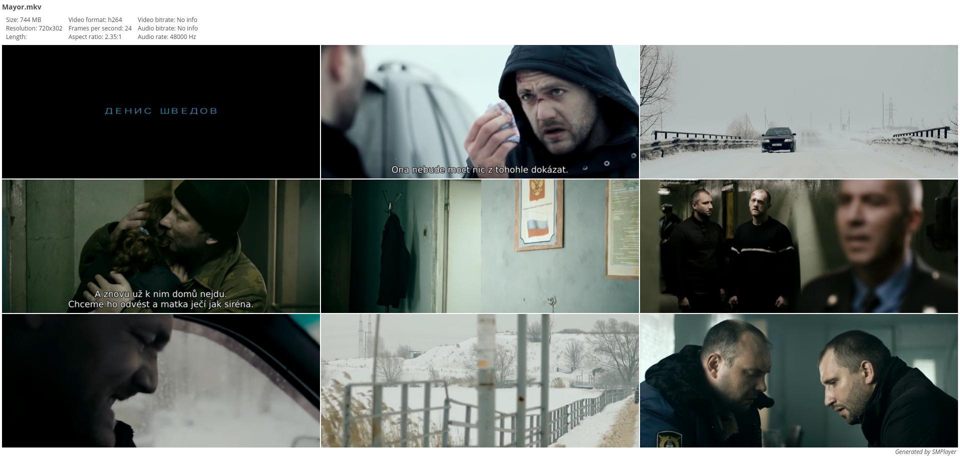MediaInfo: Format: Matroska Format version: Version 4 / Version 2 File size: 745 MiB Duration: 1h 39mn Overall bit rate mode: Variable Overall bit rate: 1 048 Kbps Movie name: Mayor Released date: Rusko, 2013 Encoded date: UTC 2016-11-26 10:01:41 / UTC 2016-11-26T09:26:22Z Writing application: mkvmerge v9.3.1 ('Mask Machine' 64bit Writing library: libebml v1.3.4 + libmatroska v1.4.5 / Lavf56.40.101 ARTIST: Denis Švedov, Irina Nizina, Jurij Bykov, Boris Něvzorov, Dmitrij Kurjanov, Dmitr DIRECTOR: Jurij Bykov GENRE: Krimi / Drama / Thriller / Akční SYNOPSIS: Expresivně natočené strhující drama o tragických důsledcích mravně pochybeného a zbabělého jednání. Policista, který přejede dítě, se obrátí na své kolegy, aby zakamuflovali jeho vinu. Tento krok uvede do pohybu mašinerii temného bezpráví, jež si vyžádá nevinné oběti