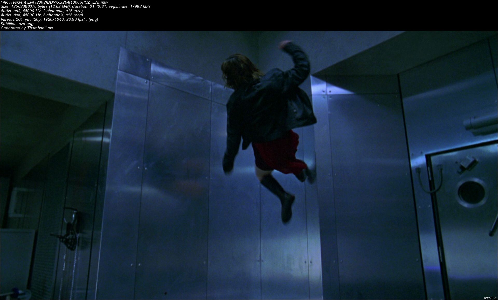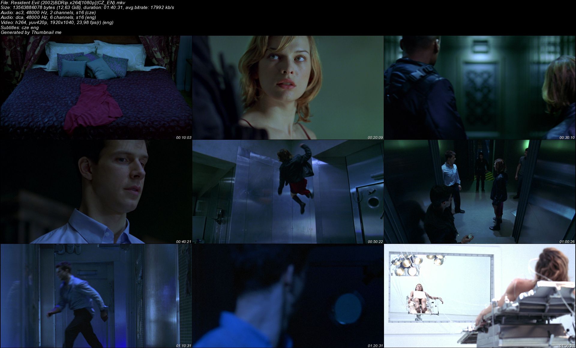 Celý název a cesta : Resident Evil (2002)BDRip.x2641080p(CZ_EN).mkv Formát: Matroska Format_Version: Version 4 / Version 2 Velikost souboru: 12,6 GiB Duration/String: 1h 40mn Celkový BitRate: 18,0 Mbps Název filmu: Resident Evil (2002) Encoded date: UTC 2016-02-07 22:05:25 Použitý software: mkvmerge v6.7.0 ('Back to the Ground' 64bit built on Jan 9 2014 18:03:17 Enkódoval: libebml v1.3.0 + libmatroska v1.4.1
