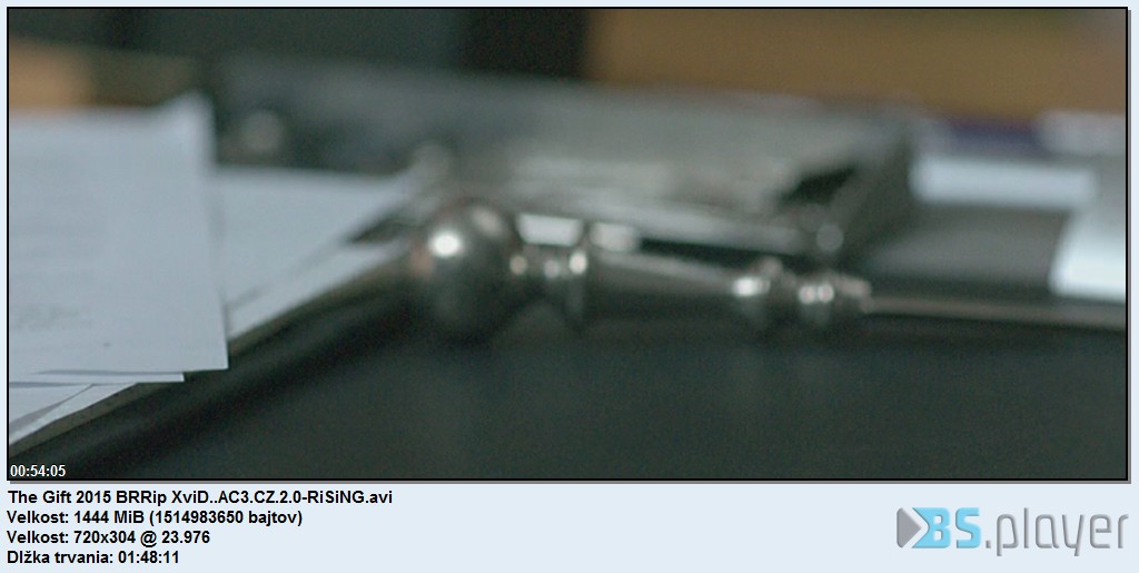 Celý název a cesta: F:The Gift 2015 BRRip XviD..AC3.CZ.2.0-RiSiNG.avi Formát: AVI Formát/: Audio Video Interleave Format_Profile: OpenDML Format_Settings: rec Velikost souboru: 1,41 GiB Duration/String: 1h 48mn Celkový BitRate: 1 867 Kbps Použitý software: AVI-Mux GUI 1.17.8.3, Feb 16 201019:42:50