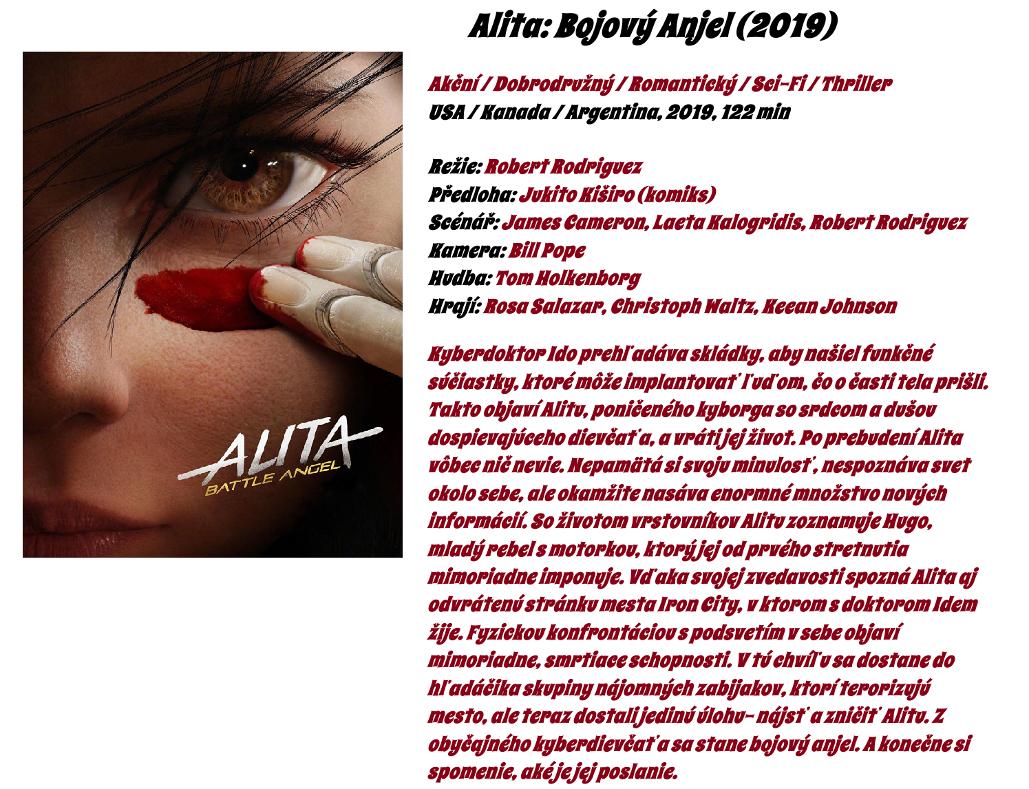 Popis : Kyberdoktor Ido prehľadáva skládky, aby našiel funkčné súčiastky, ktoré môže implantovať ľuďom, čo o časti tela prišli. Takto objaví Alitu, poničeného kyborga so srdcom a dušou dospievajúceho dievčaťa, a vráti jej život. Po prebudení Alita vôbec nič nevie. Nepamätá si svoju minulosť, nespoznáva svet okolo sebe, ale okamžite nasáva enormné množstvo nových informácií. So životom vrstovníkov Alitu zoznamuje Hugo, mladý rebel s motorkou, ktorý jej od prvého stretnutia mimoriadne imponuje. Vďaka svojej zvedavosti spozná Alita aj odvrátenú stránku mesta Iron City, v ktorom s doktorom Idem žije. Fyzickou konfrontáciou s podsvetím v sebe objaví mimoriadne, smrtiace schopnosti. V tú chvíľu sa dostane do hľadáčika skupiny nájomných zabijakov, ktorí terorizujú mesto, ale teraz dostali jedinú úlohu– nájsť a zničiť Alitu. Z obyčajného kyberdievčaťa sa stane bojový anjel. A konečne si spomenie, aké je jej poslanie.