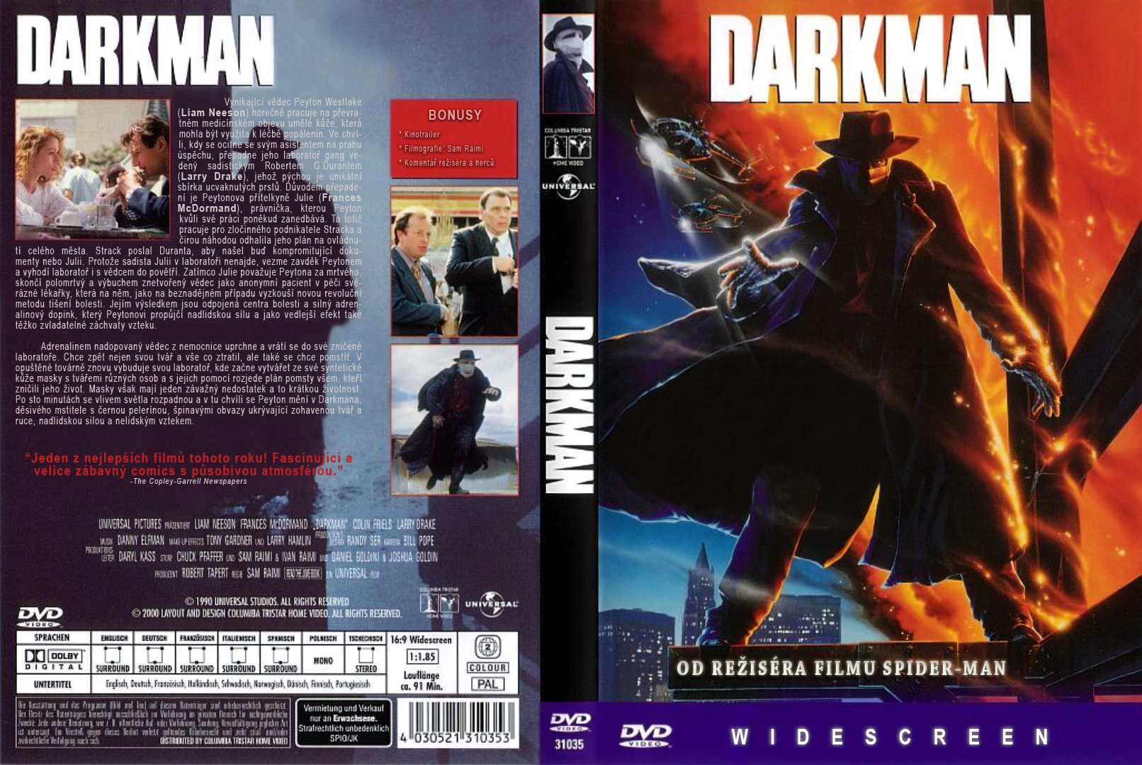 v tu chvíli se Peyton mění v Darkmana, děsivého mstitele s černou pelerínou, pinavými obvazy ukrývajícími