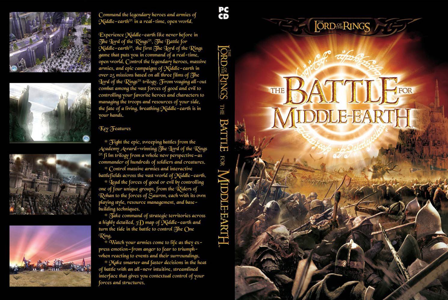 Real-Time Strategie, První hra ze ságy Pána Prstenů, ve které je obsažen téměř celý děj známý z filmů. Možnost velení velkým armádám, hra za dobro i za zlo, volná hra s poítačem na více než 30 různých mapách, propracovaný bojový systém, vizuálně výborně propracovaná grafika.