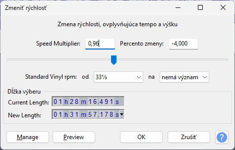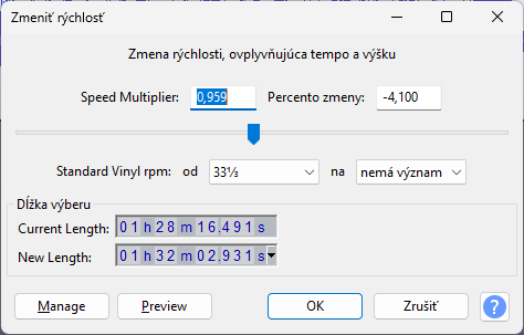 Najlepsie oznacit vsetky stopy staci CTRL + A inak dalej nepusti v uprave vyberieme Efekt - vyska tonu a tempo - zmenit rychlost a vysku.